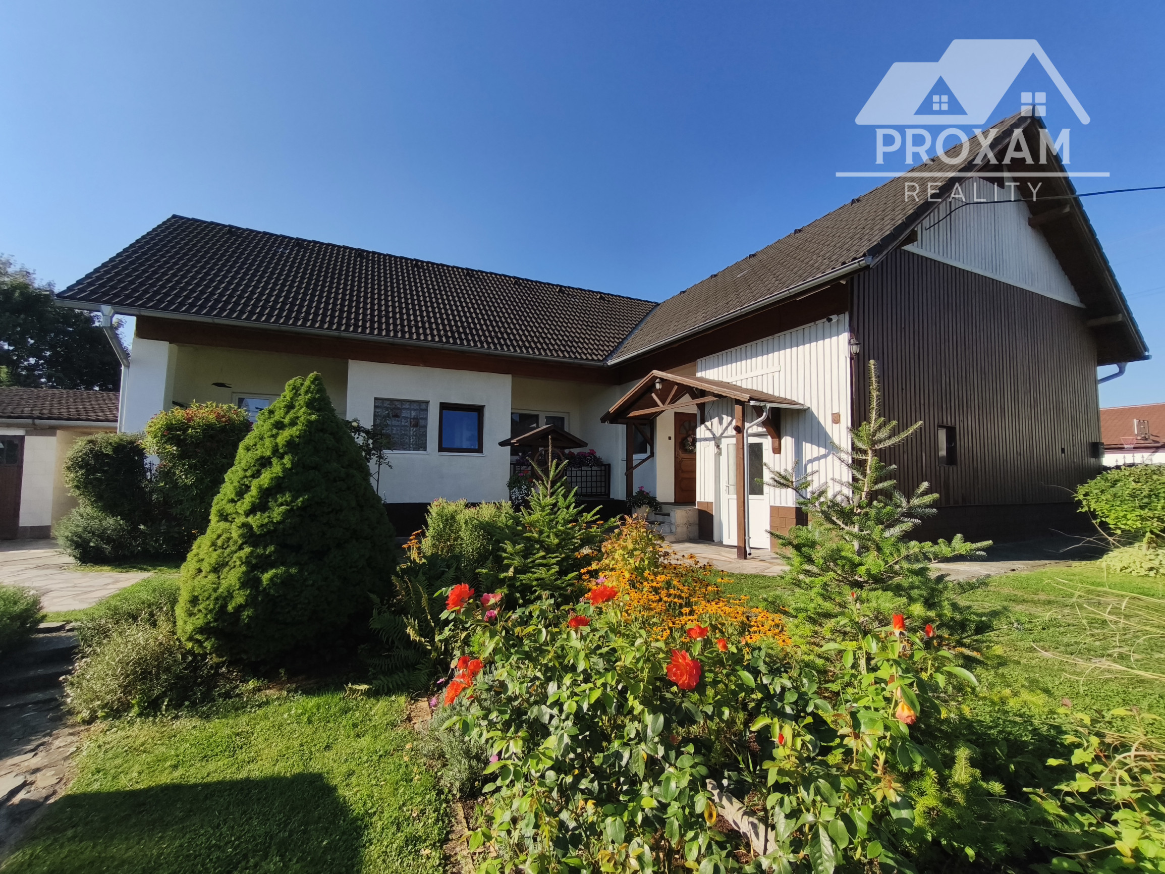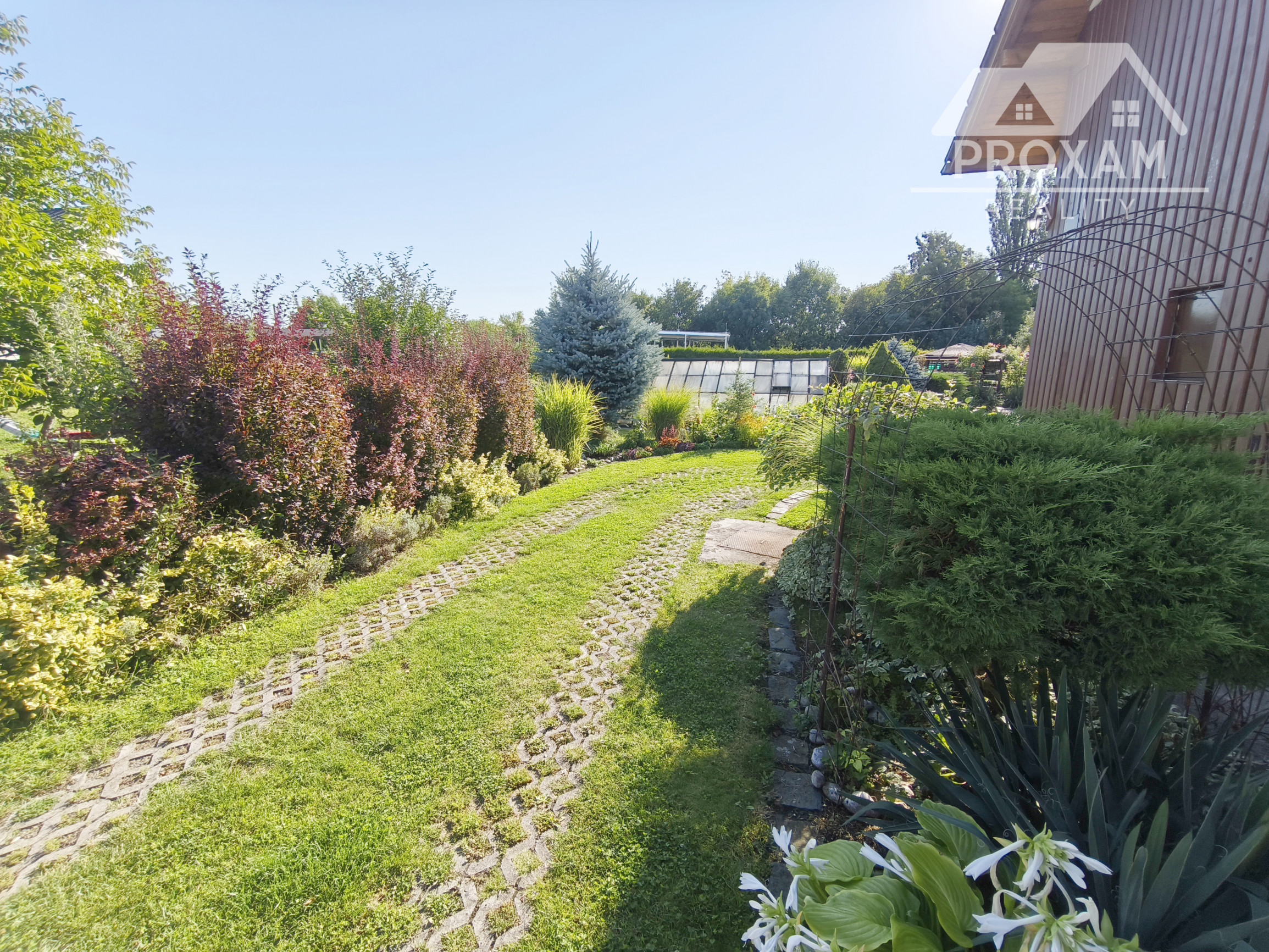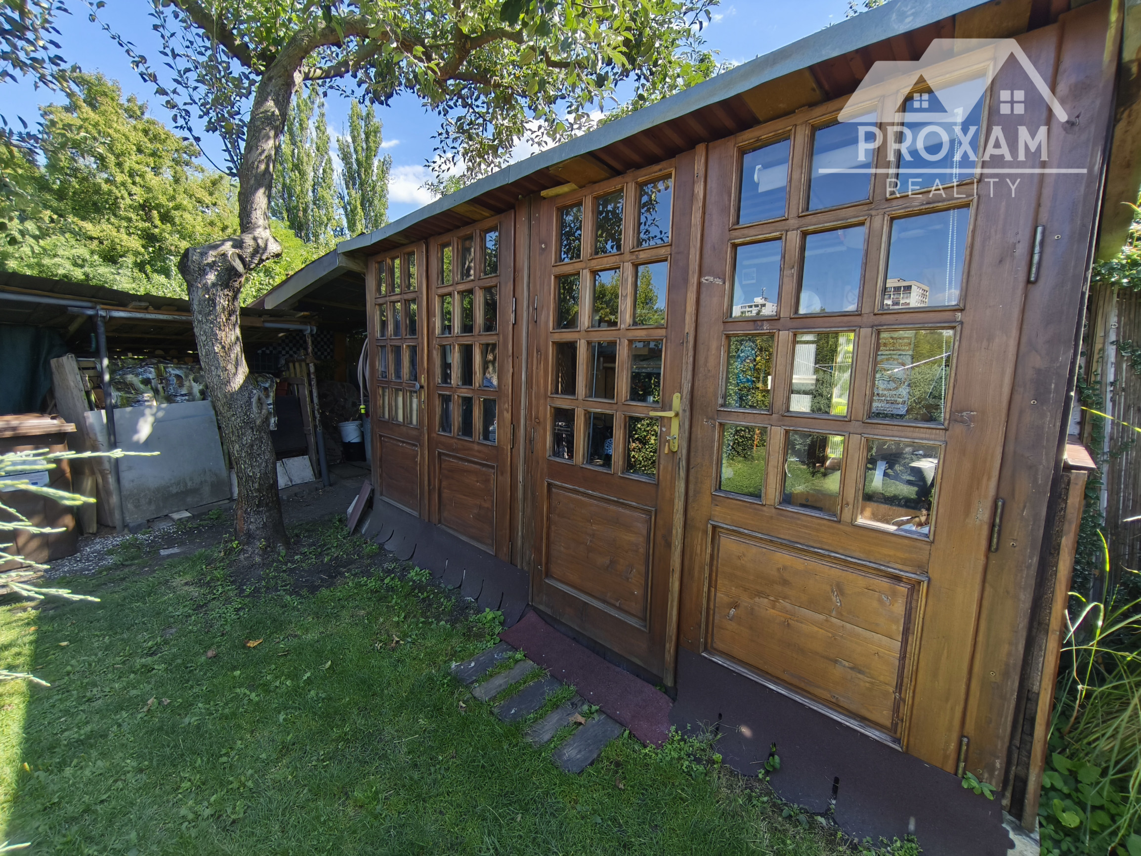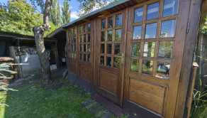 Upravená záhrada s okrasnými drevinami, ovocnými stromami, kvety, trávnik, skleník, vstupná bránka a brána na vjazd s autom. Pozemok celý oplotený. Drevený altánok, záhradný domček, miesto na ukladanie dreva.