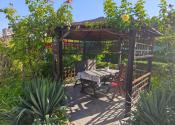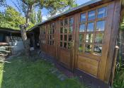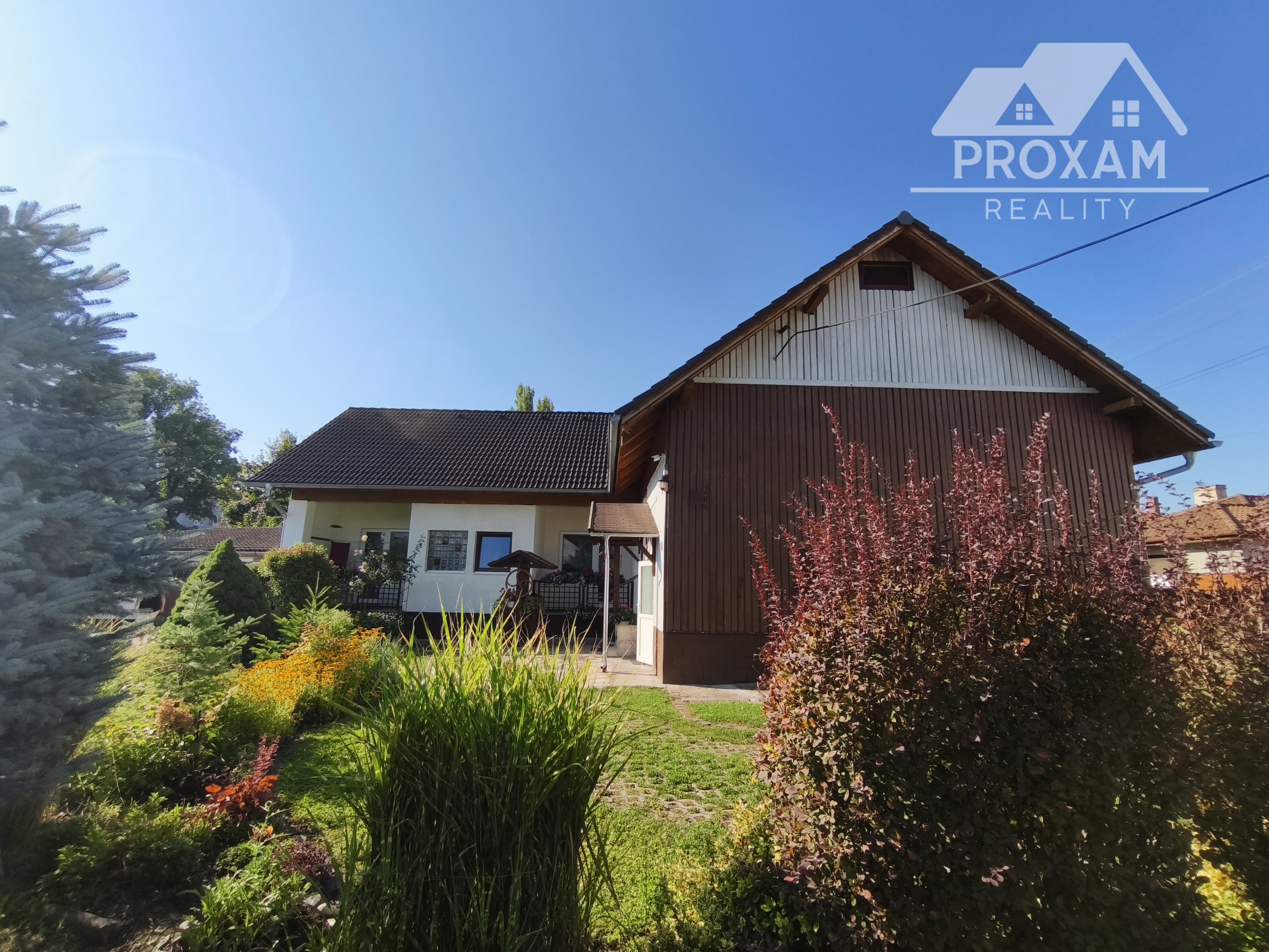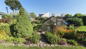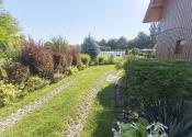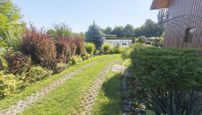 Upravená záhrada s okrasnými drevinami, ovocnými stromami, kvety, trávnik, skleník, vstupná bránka a brána na vjazd s autom. Pozemok celý oplotený. Drevený altánok, záhradný domček, miesto na ukladanie dreva.