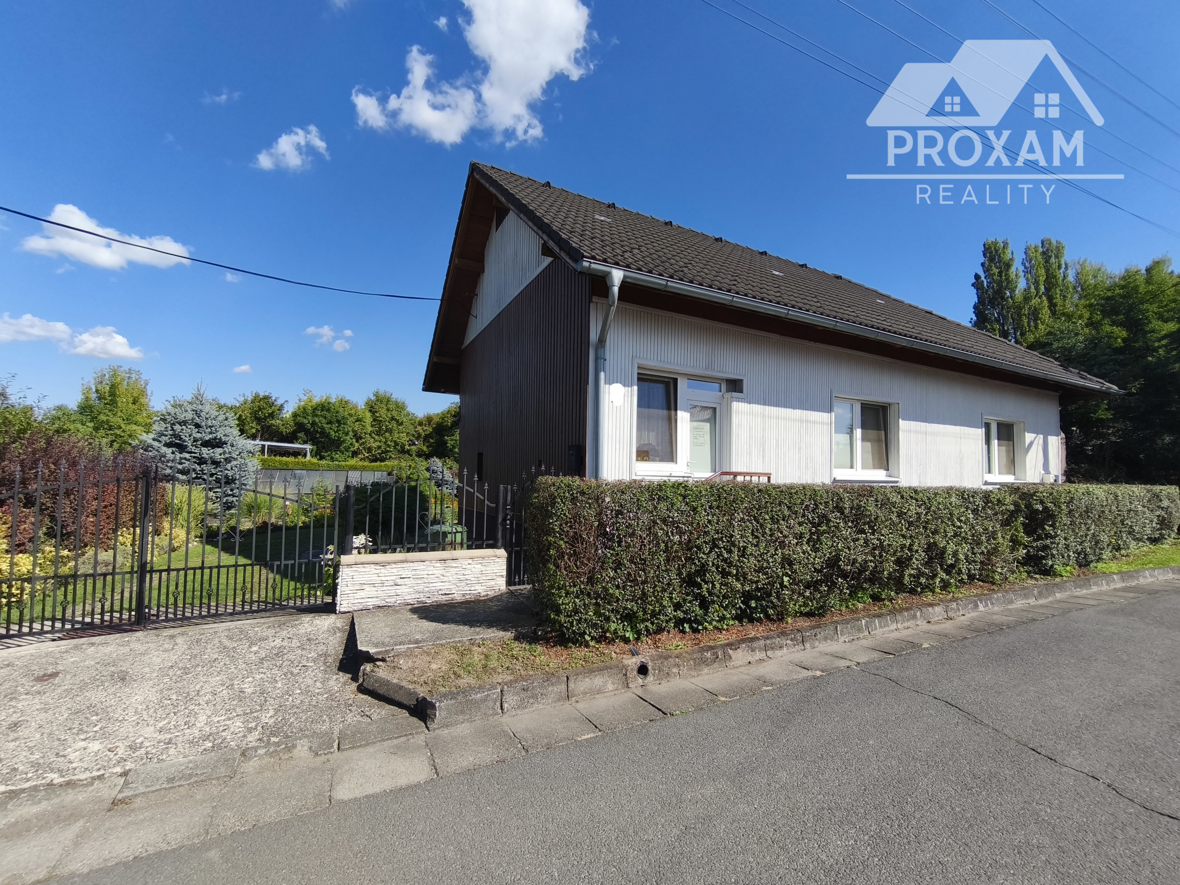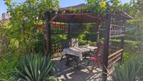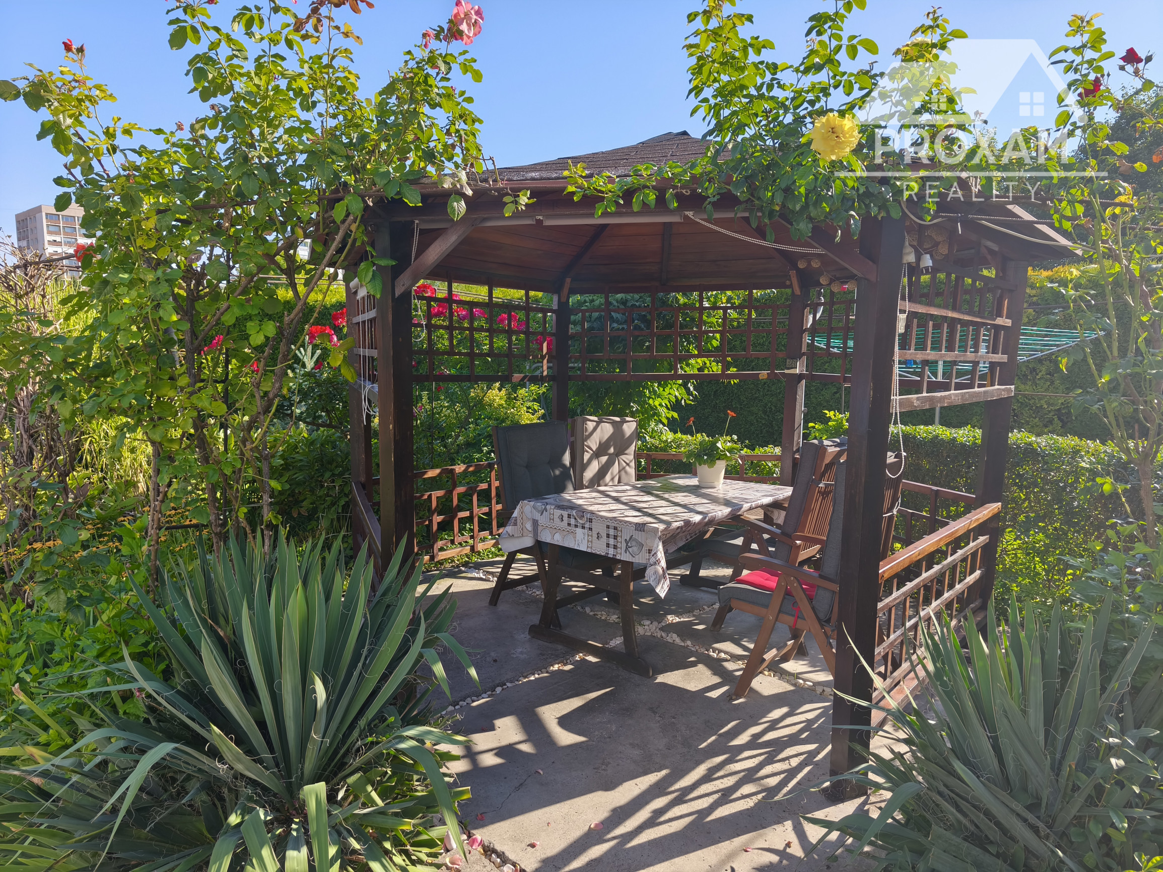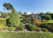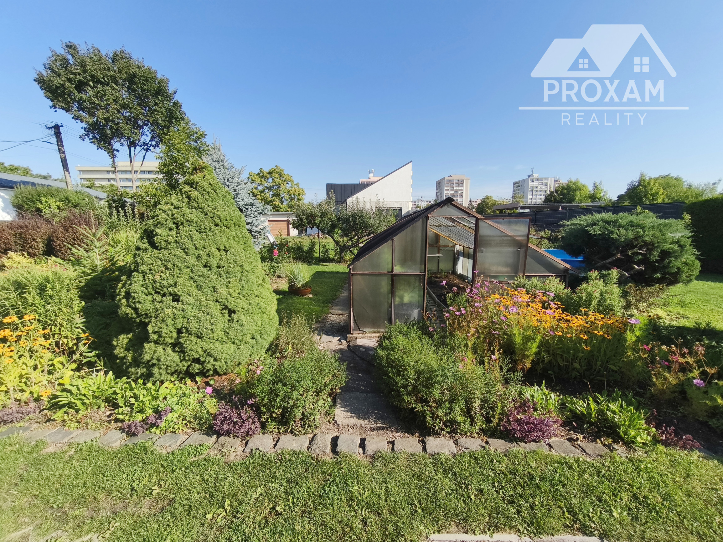 Upravená záhrada s okrasnými drevinami, ovocnými stromami, kvety, trávnik, skleník, vstupná bránka a brána na vjazd s autom. Pozemok celý oplotený. Drevený altánok, záhradný domček, miesto na ukladanie dreva.
