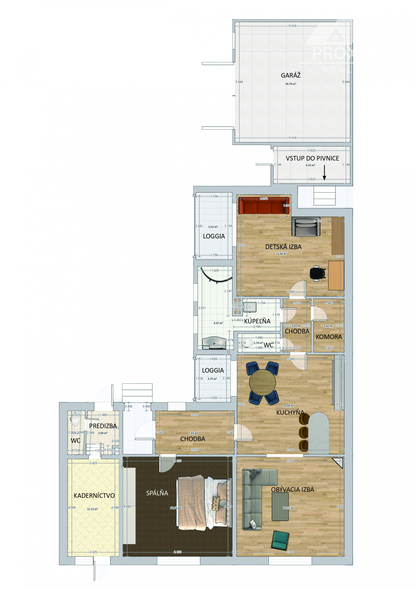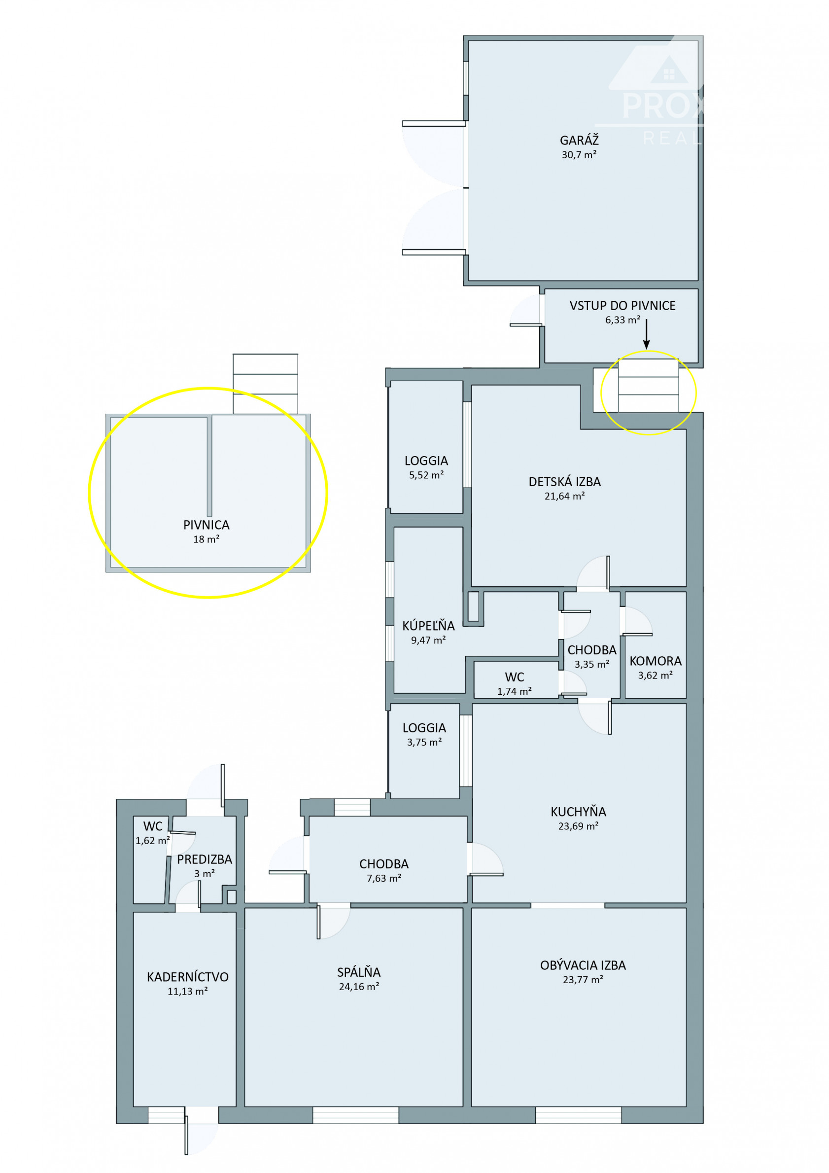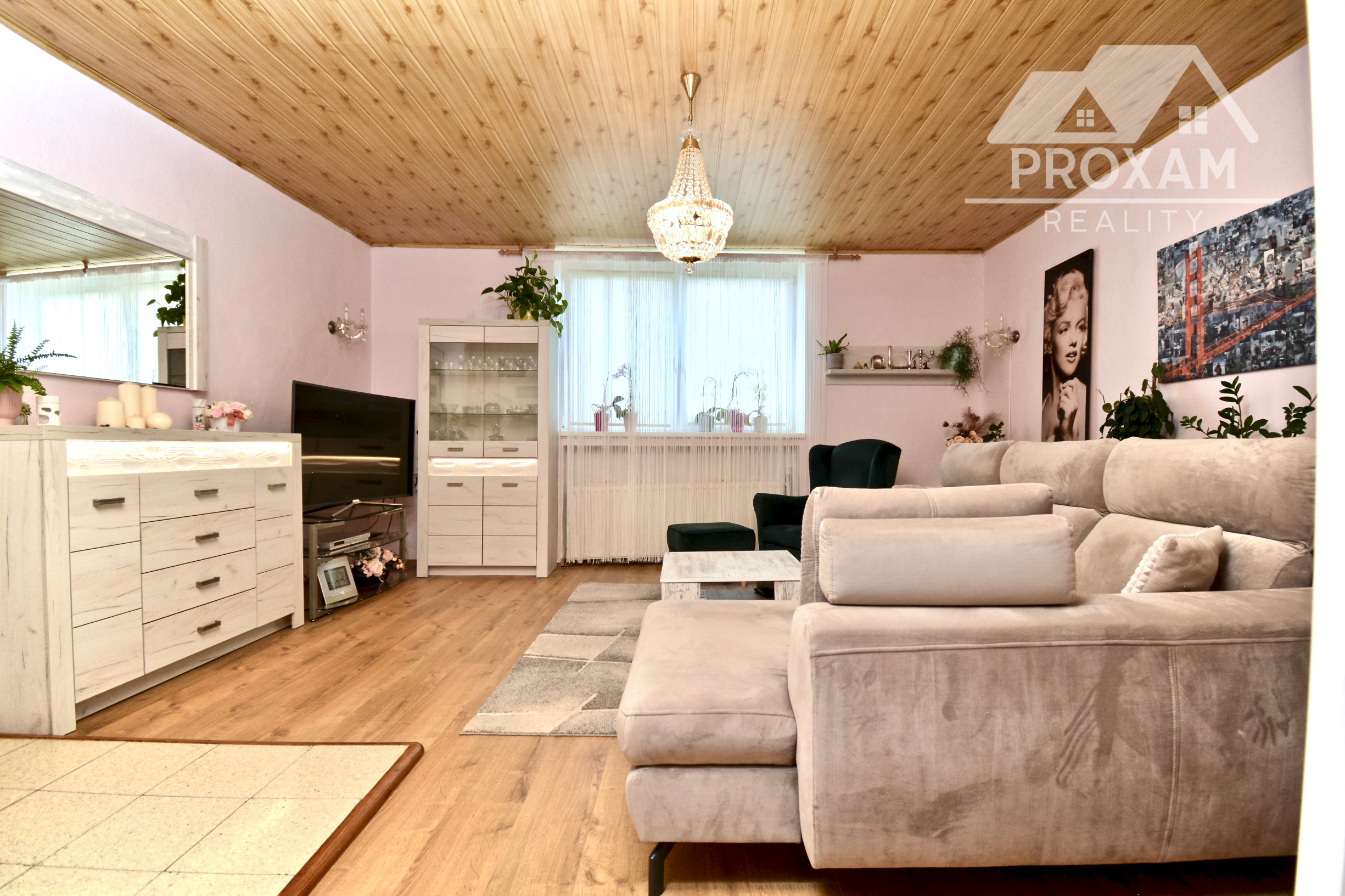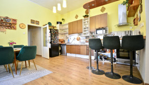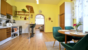 Priestor poskytuje vysoký štandard bývania aj potenciál pre komerčné využitie. Vstupná chodba, otvorený koncept kuchyne prepojenej s obývacou izbou, vytvárajúci svetlý priestor, dve nepriechodné izby s veľkorysými loggiami, ponúkajúce výhľad do upravenej záhrady a ideálne miesto na rannú kávu a večerné posedenie. Samostatná miestnosť aktuálne využívaná ako kaderníctvo, s praktickým prístupom z ulice aj z dvora. Presvetlená kúpeľňa, dve toalety s umývadlami a veľká komora. Dom je čiastočne podpivničený, priestor sa využíva ako technická miestnosť a úložný priestor. K domu je pristavená priestranná murovaná garáž.