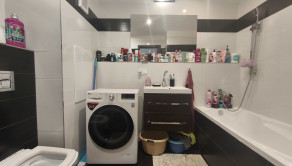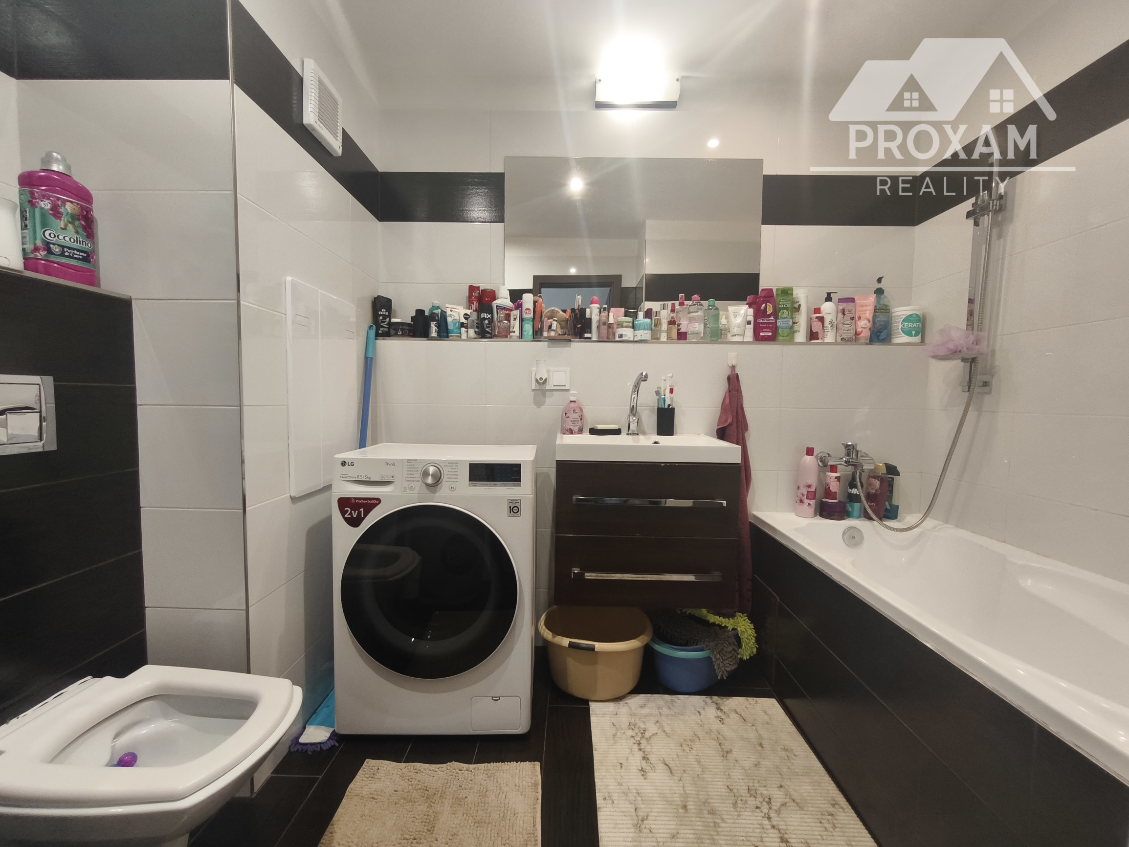 kúpeľňu s vaňou, WC, umývadlom a veľkým zrkadlom