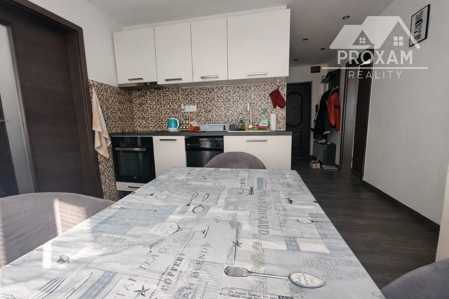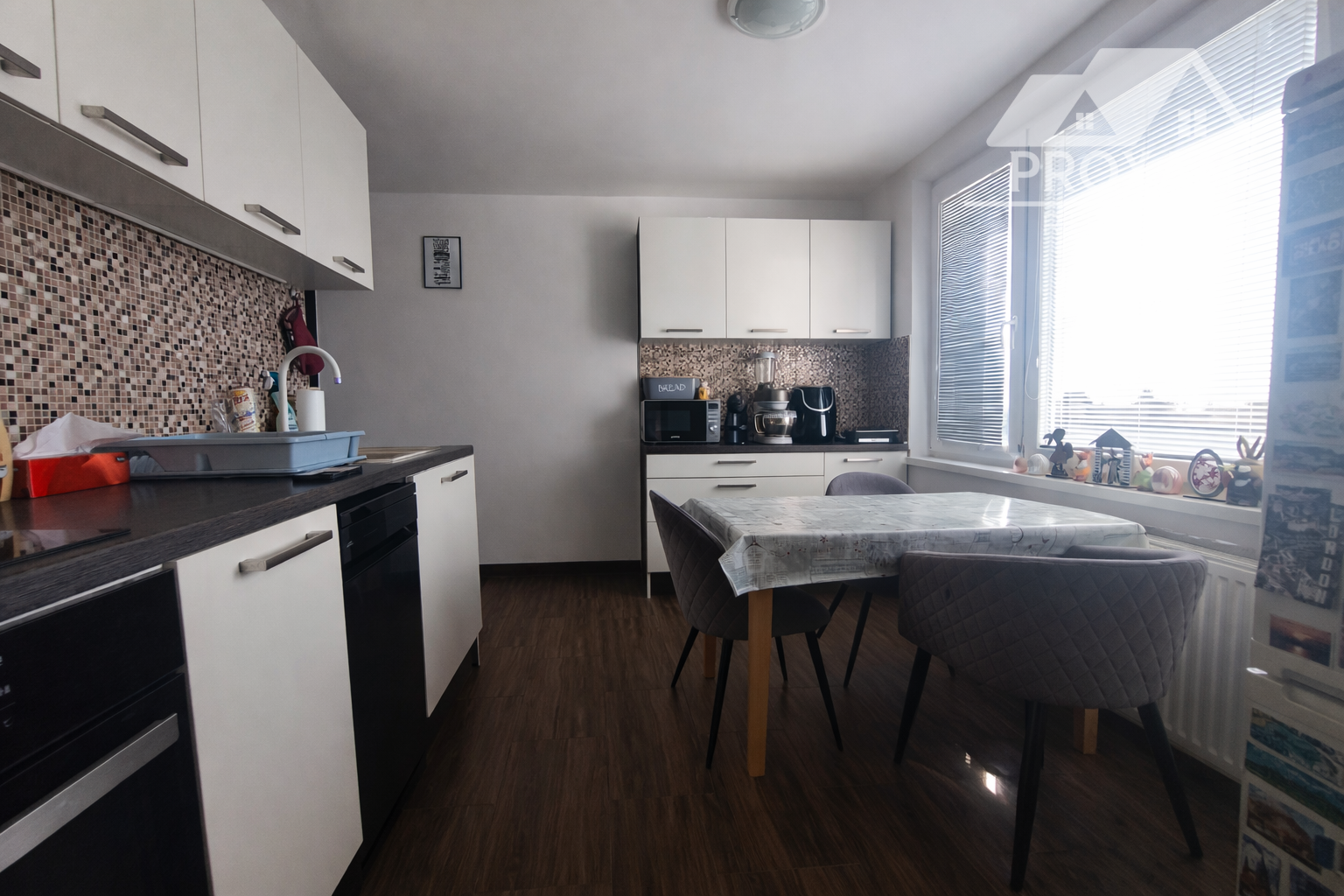 modernú kuchyňu so spotrebičmi (umývačka riadu, elektrická rúra, varná doska, chladnička, mikrovlnná rúra)