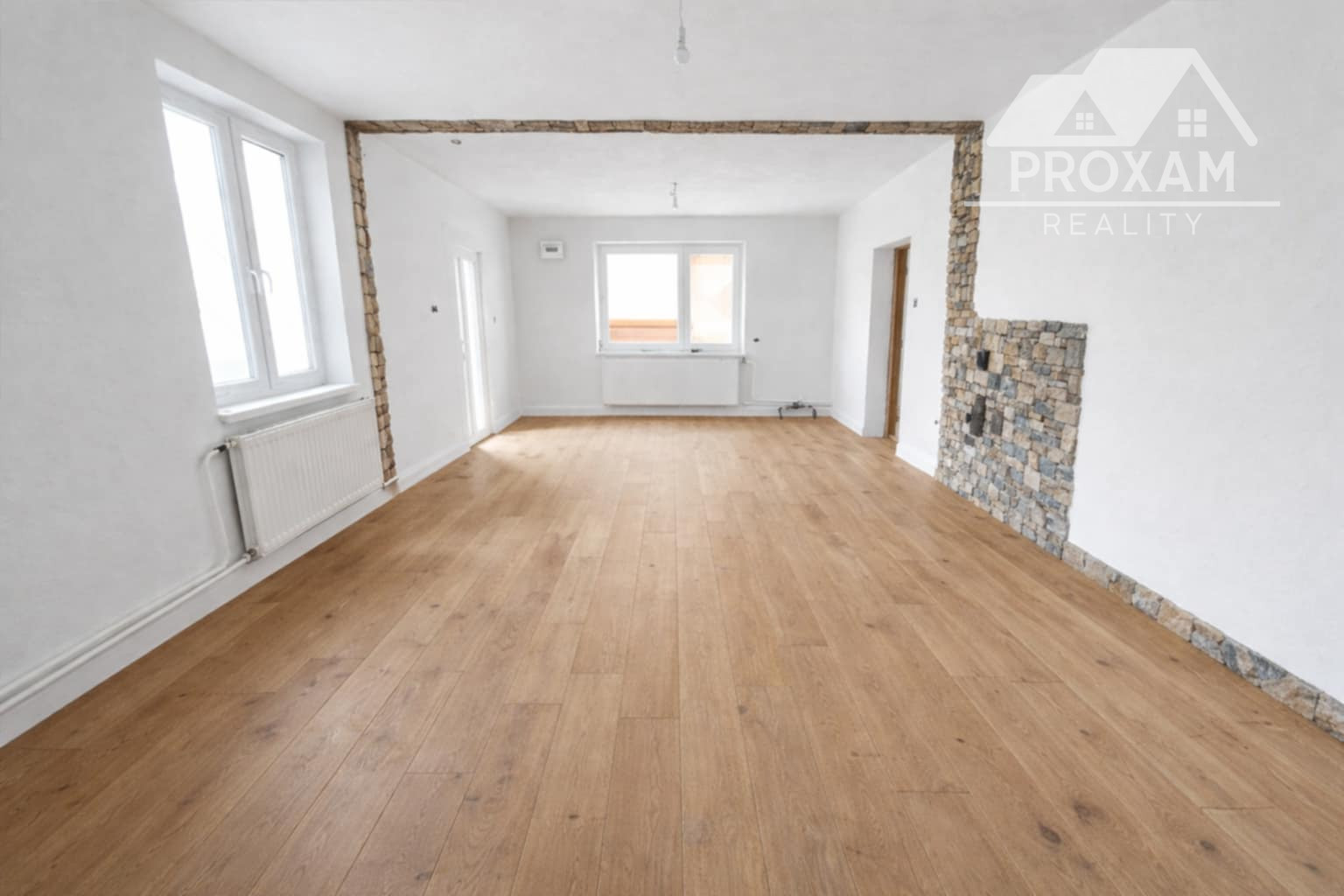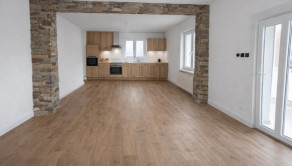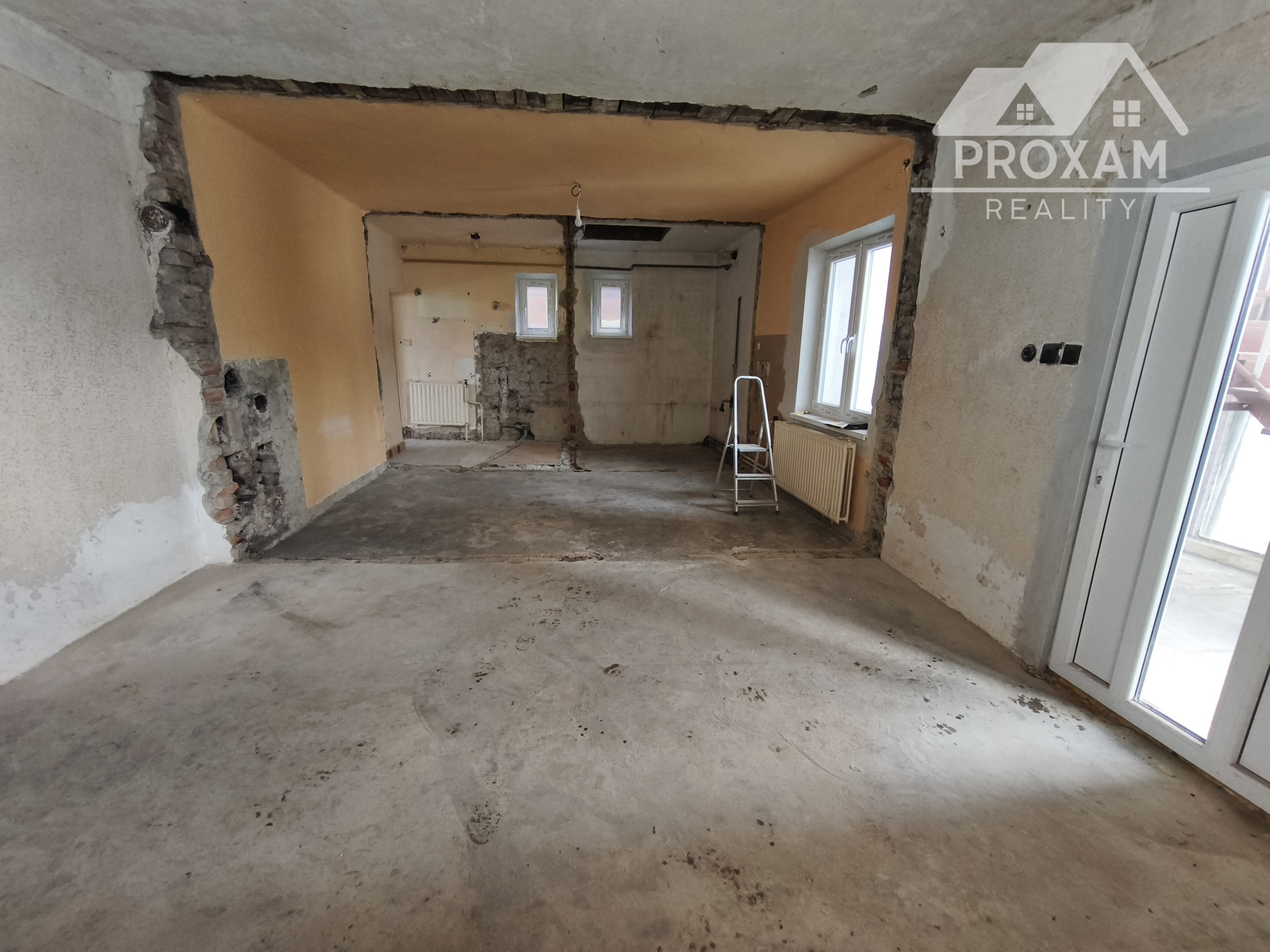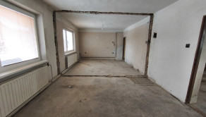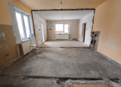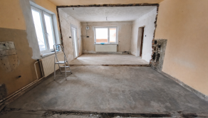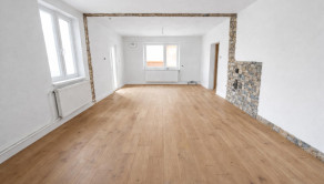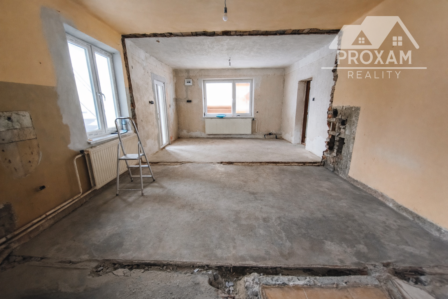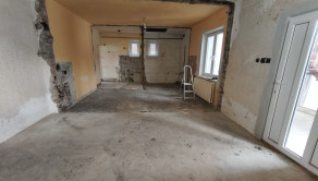 Vnútorné priečky sú odstránené, vznikol veľký otvorený priestor, ponúka dve veľké izby a prístup do podkrovia.
