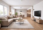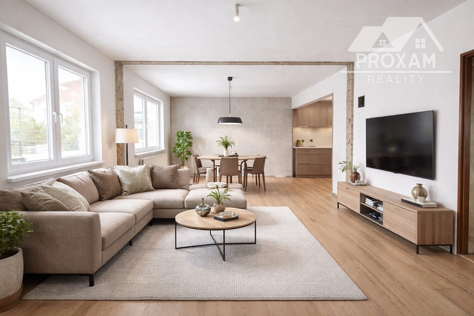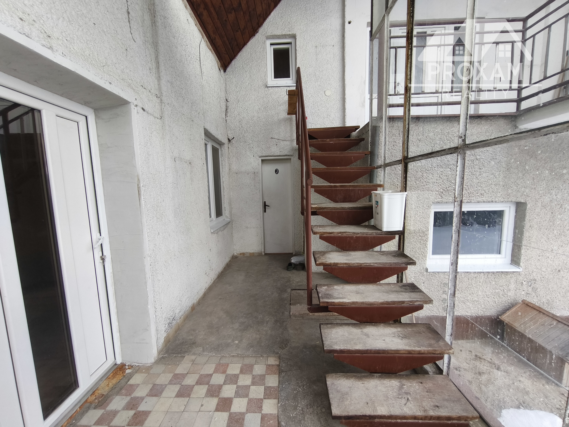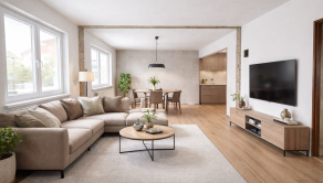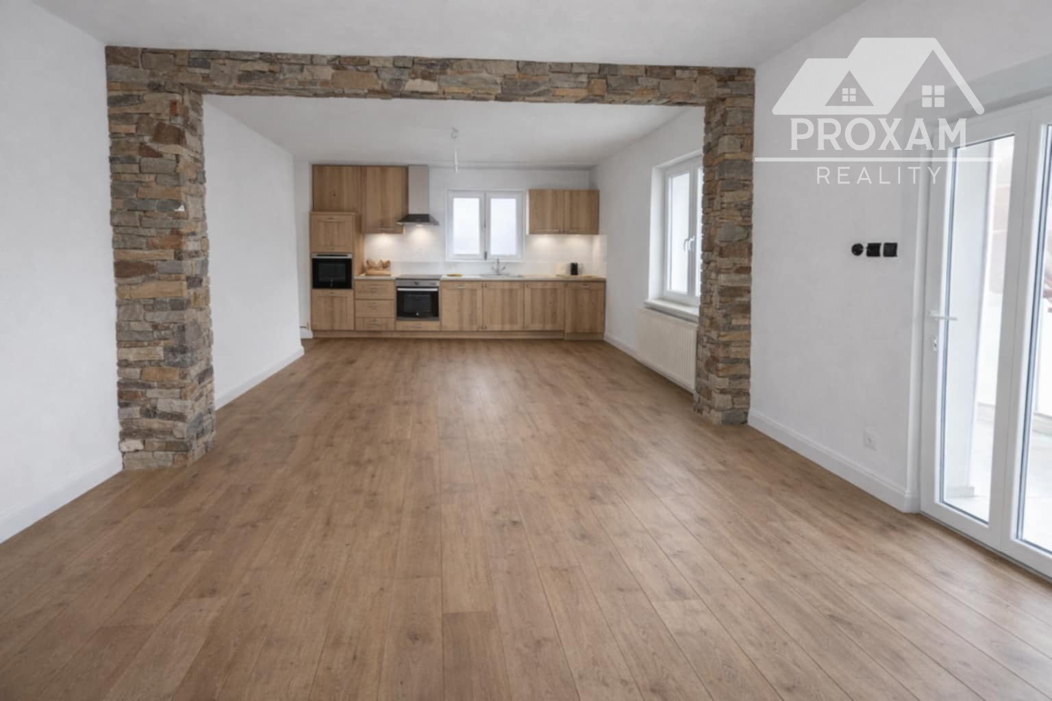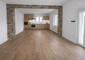 Vnútorné priečky sú odstránené, vznikol veľký otvorený priestor, ponúka dve veľké izby a prístup do podkrovia.