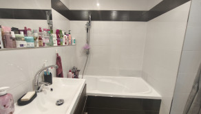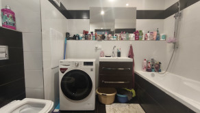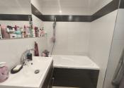 kúpeľňu s vaňou, WC, umývadlom a veľkým zrkadlom